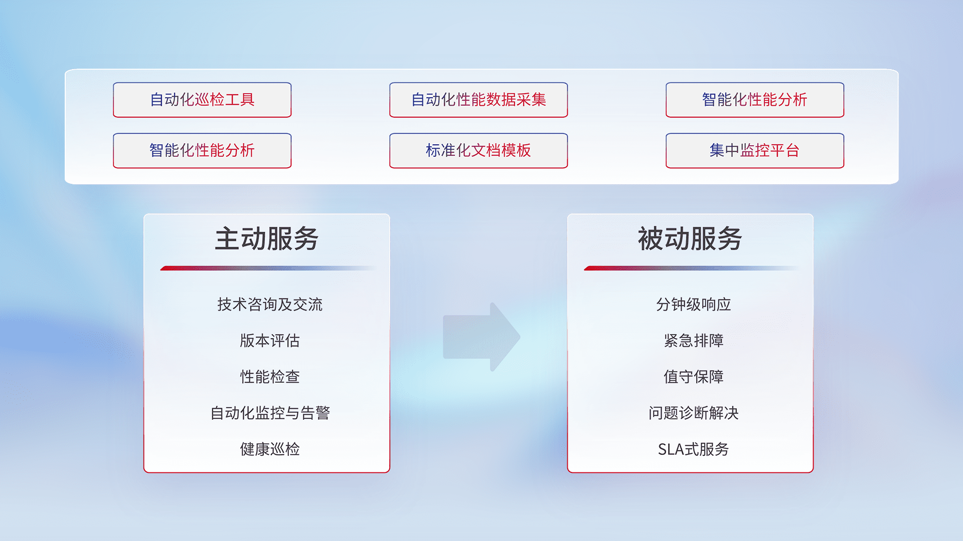 智能化工具和标准化文档,,,保障服务质量,,,提供主动服务(包含技术咨询、、、、版本评估、、、性能检查、、、、自动化监控与告警、、、健康巡检)和被动服务包含(分钟级响应、、、紧急排障、、值守保障、、、问题诊断解决、、、SLA服务)。。