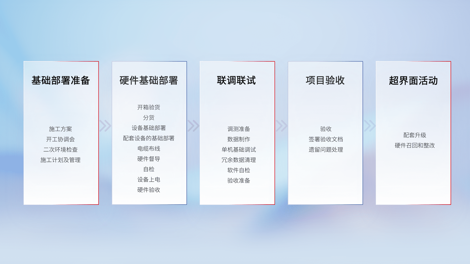 从基础部署准备、、硬件基础部署、、联调联试、、、、项目验收、、、越界面活动的全过程可追溯,,,保证施工质量和进度。。。。